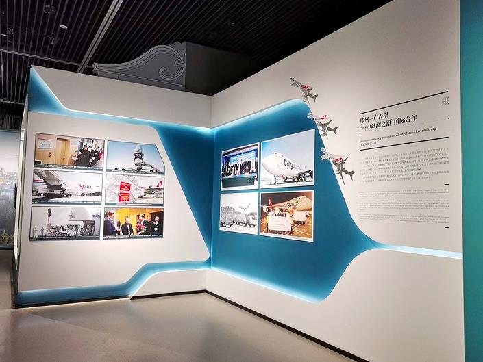 這一主題展板上,精選了10張圖片記錄豫盧共建“空中絲路”的關鍵事件。既有2014年河南航投與盧森堡貨航在鄭州簽署股權合作協議、“鄭州號”巨無霸貨機首次抵鄭的起始節點;也有這條絲路承運河南省向盧方捐贈的抗疫物資、鄭盧直飛客航首批旅客抵達的溫暖瞬間;還有盧森堡貨航在鄭州加注可持續航空燃料、鄭盧航線貨運量突破100萬噸的喜慶時刻,精彩講述豫盧雙方在“一帶一路”框架下相融互促,從硬聯通、軟聯通到心聯通的生動實踐。